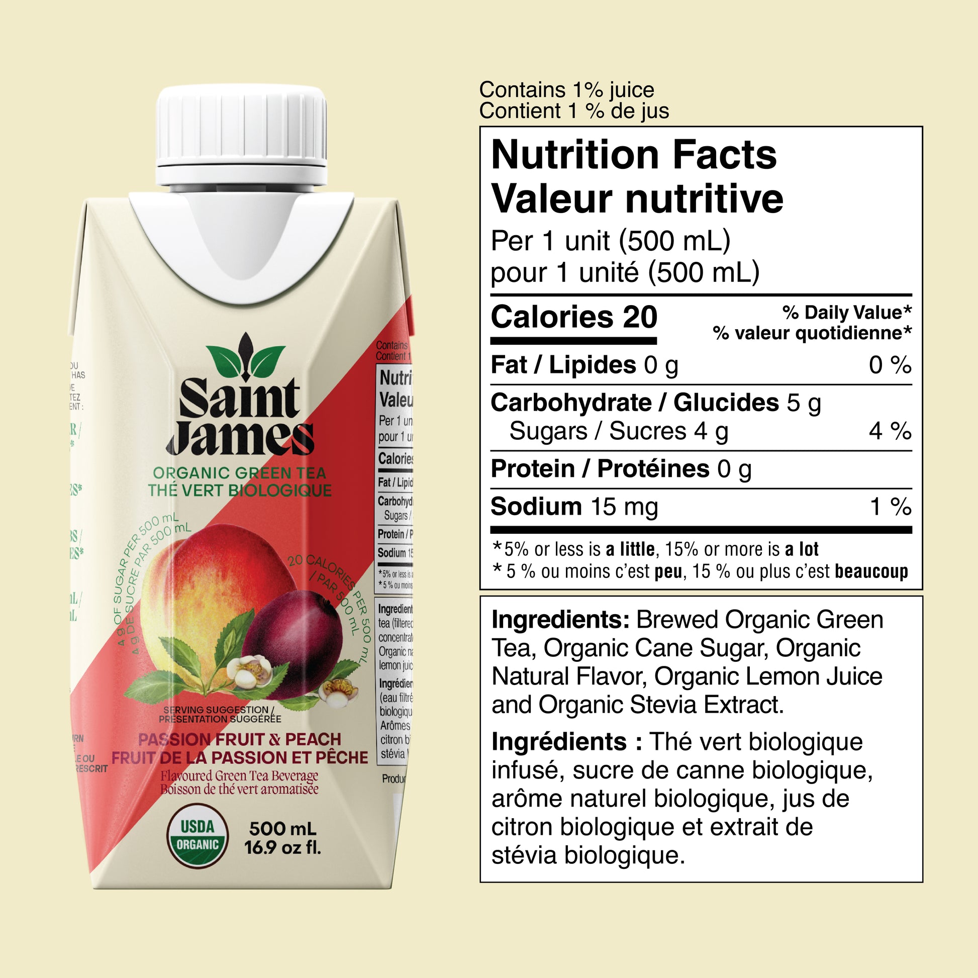 Passion Fruit and Peach is a refreshing safehaven from sugary peach tea drinks. Organic green tea with all-natural fruit flavor and just the right amount plant-based sweetener results in the perfect balance. Grounded by real peach flavor and brightened with an edge of passion fruit. With only 4 grams of sugar and 25 calories overall, Passion Fruit and Peach is simply inspiring.